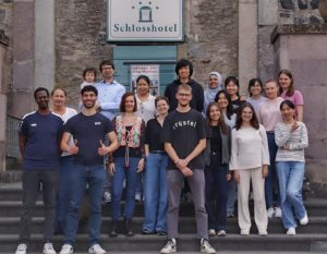 The Helfrich lab team in spring 2025 at the Biozentrum Frankfurt, posing with their favorite lab tools.